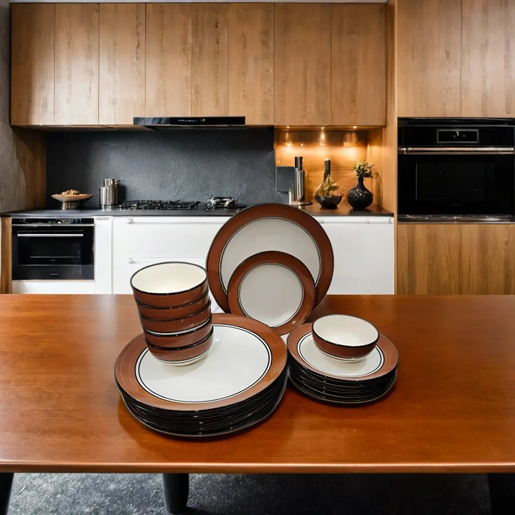 ​Elegant 18-Piece Glossy Ceramic Dinner Set – Service for Six (White & Brown)