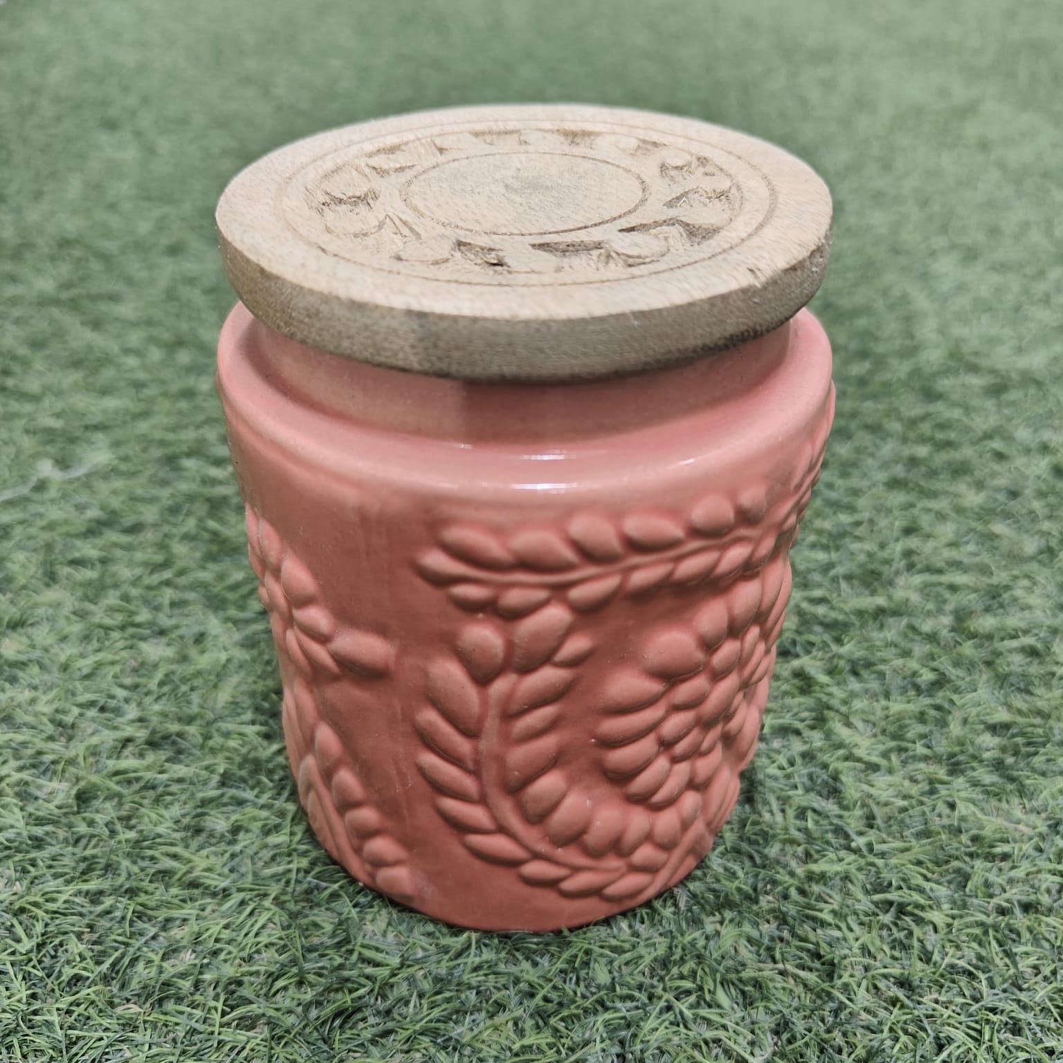 Ceramic Jar with Airtight Wooden Lid – 300ML (Pink Embossed)