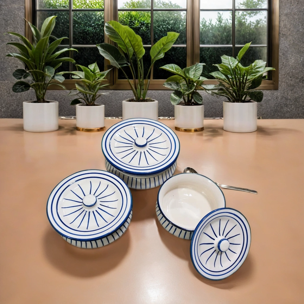 About this item Perfect for gifting and serving while dinning , serving handi set , party dinning bowl , premium showcasing at kitchen and dining space Material: Ceramic studio pottery Dishwasher safe/ Microwave safe/ Freezer safe/ Color Does not fade. Capacity: 1200ml, 800ml, 500ml . Sponge in Warm Soapy Water is Recommended. Do not Use Scrub Chip Resistant